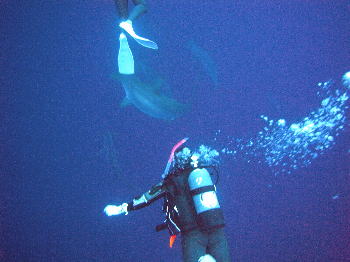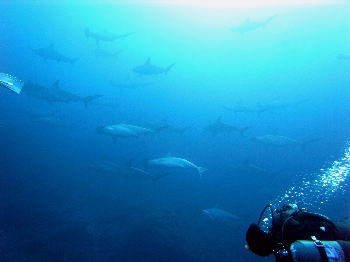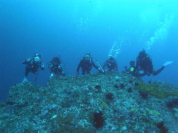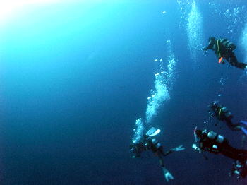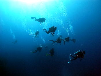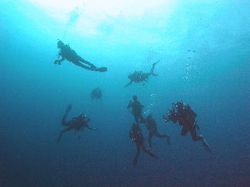 どどどっと潜行して、ガイドさんの周りへ集合です! 青い青い中層を、ずんずん進みます。 |