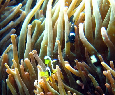 シャクシの浜では 可愛いクマノミ&ミツボシクロスズメダイの赤ちゃんが いっぱいついていました♪ ベビーラッシュがやってきましたね〜! |