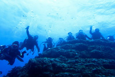 | さぁ、仲之神島です! 水中にそびえ立つ巨大な岩の間を 悠々と飛んでいきますo(^-^)o |