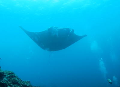 | そして、お待ち兼ねの「マンタ様」との出会いです! ドキドキ☆ワクワクしながら 根につかまってじーっと待っていると・・・ やってきました、マンタ様です〜ぅ\(^o^)/ |