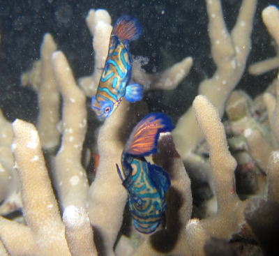 | 日中に3ダイブしたら、夜はこの季節ならではの ニシキテグリの産卵を観察に行きましたよ〜!! じーっと待つこと数10分・・・ だんだんとニシキテグリカップルの テンションが高まってくるのが分かりますo(^o^)o そして、何回かのトライの後・・・きたーっ!!!!! 産卵成功です! 上側のメスのテグリのお腹の辺りに 白いモコモコした卵のツブツブが写ってますよ〜(^-^)v 超ラッキーでしたね〜♪ 待った甲斐のあるナイトダイビングになりました! |