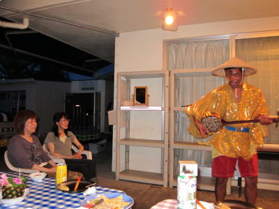 | そして、なんとこの日の特別ゲスト登場〜♪ 金城のおじいが、三線を片手に現れてくれました! 沖縄民謡と楽しいおじいの会話を楽しんで、 楽しい楽しい最後の夜になりました! おじい、有難うございました(^○^) |
