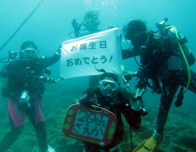 20歳お祝いダイブへ向けて、 まずは皆で記念撮影〜(*^。^*) Happy Birthday〜〜〜!!! |
