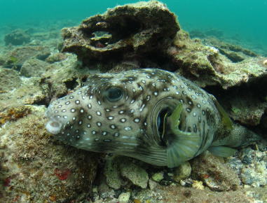 | 最後のビーチでは バスケットボールサイズの 巨大サザナミフグにも遭遇〜♪ 微動だにしない貫禄がありました! |