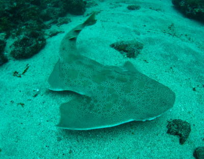 | なんと、なんと5月も終わりが近づいたこの季節に 巨大カスザメさんと遭遇〜っ! 体が重いせいか、ちょっと泳いでは着底・・・ 頑張ってね〜! |