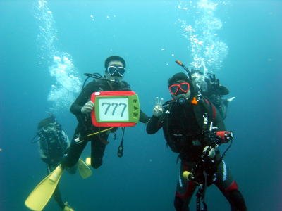 水中で、お祝いの記念撮影です! Iさん これからも200本、300本・・・500本と そして、○○歳・・・60歳、70歳と 潜り続けてくださいね〜(^_-) おめでとうございます!! |