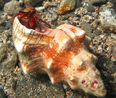| ここからは、ヤドカリさん特集です。 皆さん、講習1ダイブ目にして、ヤドカリの戦いと 貝からでてきたヤドナシのヤドカリさんを目撃してしまいました〜っ! ![]() ![]() まずは飛び出してきたヤドカリさん おもむろに貝に乗っかって〜 |