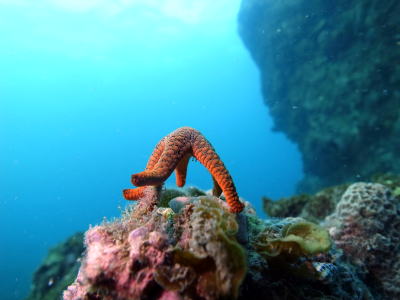 かわいいマダライロウミウシちゃん(*^。^*) となりのヒトデと比べると ちっちゃさが分かりますね〜!! |