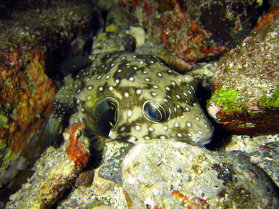| 夜にはナイトダイビングで 初めての水中夜遊び〜♪ カワイイサザナミフグのおこちゃま(*^。^*) 眠くて眠くて仕方ないようで 全然逃げなかったんですよ〜っ! |