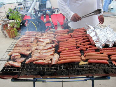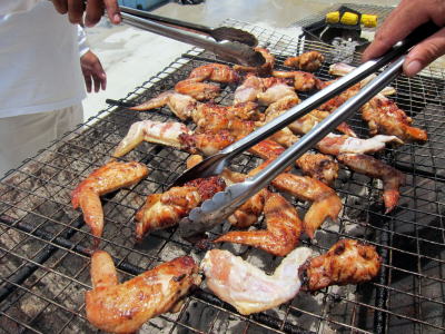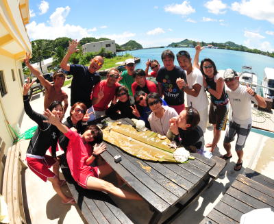 | 島に戻ってからは 皆でBBQターイム♪ 新しくなったオアシスダイビングサービスで 海を見ながらカンパーイ(^○^) チキンにポークにウィンナーに パラオで採れたお野菜にetc 美味しくいただきました! |