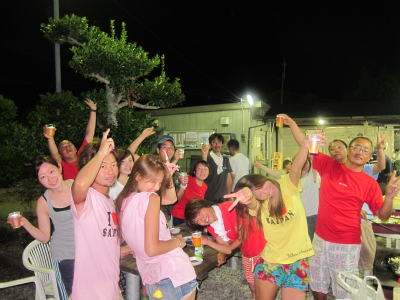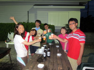 お盆期間中には、2回BBQを開催〜(^-^) たまたまご一緒した皆様も一緒にかんぱーい!! あっさり系の新メニューも開発しましたよ♪ |