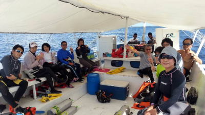 | 皆様、念願のジンベイとのダイビングを終えて 大満足v(^-^)v でも、また会いたいですね〜♪ |
