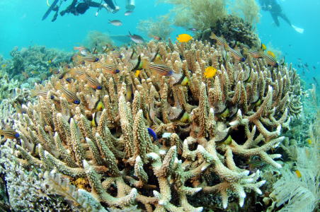 こちらはサンゴの隙間のマンジュウイシモチ♪ ここのマンジュウはきれいな海のきれいなサンゴにお住まいでした! 手前や奥に写っているガヤには要注意ですよ〜(^_-) |