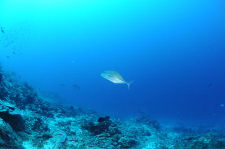 | 最終日はコンティキのハウスリーフでメアジの大群狙いです! ドロップオフの壁沿いにもびっくりするくらいのメアジ!! 最後の棚の上ではいい感じにアジ玉もできてました(^○^) |