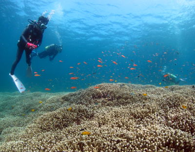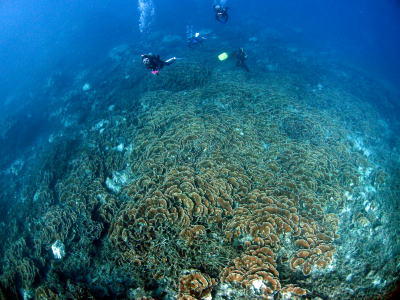 | さらにリュウキュウキッカサンゴの大群生です\(^o^)/ ダイバーにサイズと比較するとその広大さが 分かるでしょうか〜?! |
