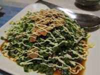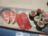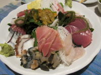 | メニューも色々ありましたが もちろんマグロ三昧に お造りに、かつおのねぎまみれに 黄色いのは生ウニのソーメンチャンプルーなんですが 濃い味が絶品でした\(^o^)/ |