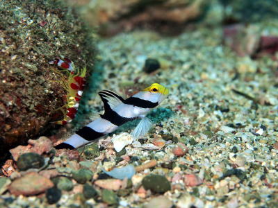 | ネジリンボウと共生エビさん なかなか難しいシーンを激写です! しかもエビさん、なんでそんな急な壁をよじ登っているのでしょうか〜? |