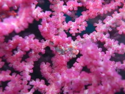 | 一眼レフのこちらの写真は〜 珍しいゴルゴニアンシュリンプ♪ これも意外と撮影が難しいんですよね(>_<) |