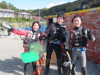 | 翌日は、日帰りで参加のお二人も合流〜っ! 初串本&初ドライスーツにチャレンジしました(*^。^*) 上手に潜られてましたよ♪ これから近場の海もどんどん潜りに来て下さいね〜!! |