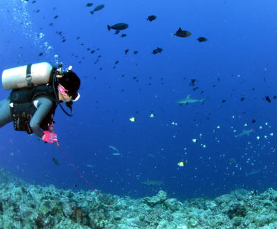 | この写真でサメの多さがよーく分かりますね(^○^) カレントフックで高い位置から見下ろすと それは、もう大迫力o(^-^)o カスミチョウチョウウオと アカモンガラはまるで背景のように 溶け込んでおります! |