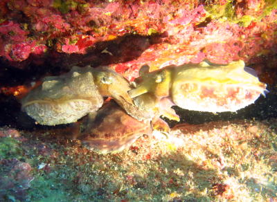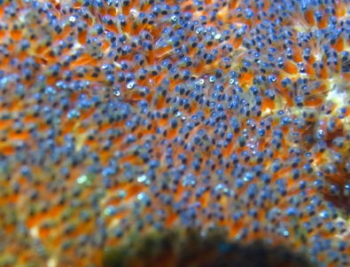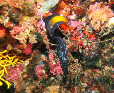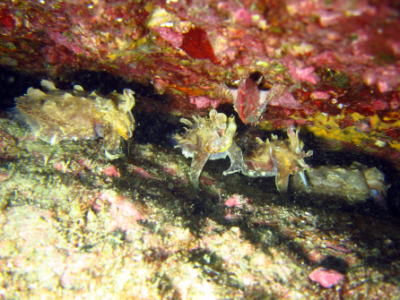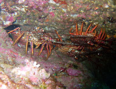 | 他にも割れ目にはイセエビがいました! おなかにはオレンジの卵をいっぱいかかえて せっせとお世話をしていましたよ(^-^) |