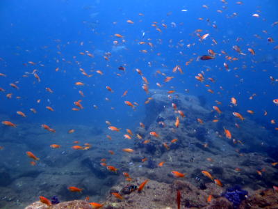 さらに〜こんな感じでキンギョハナダイが乱舞していたり カシワハナダイの婚姻色に コロダイやハマフエフキも産卵準備のためか 大集合していましたよ〜(^○^) |