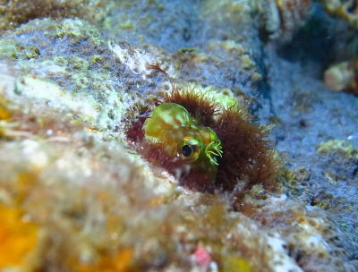| こちらは穴があったら入りたい・・・ のに、穴が見つからず全身が丸見えになっちゃった ニラミギンポさんです(*^。^*) |
