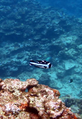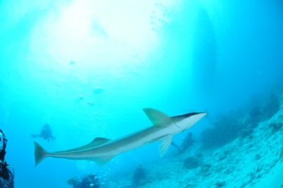 | 遊泳中のコバンザメも目の前で激写〜(^_-) 透明度がいいので 向こう側には船も見えていますね〜♪ |