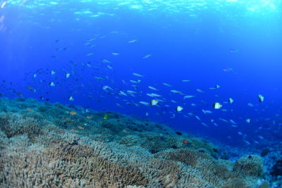 | 今年の青さはこれまでの座間味ツアーの中でも まさにTOPクラス(o^o^o) その青い海に、サンゴとグルクンが映えますね〜! |