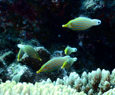 | サンゴの隙間には こちらも可愛いテングカワハギさんっ! なんですが、なんと6匹も一緒にプカプカしてますよ(´∀`) 仲良しさんですね〜♪ |