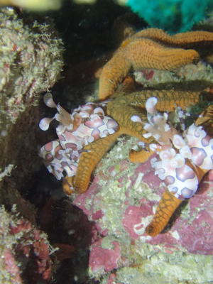| マクロも得意なカメラなので フリソデエビのペアもばっちりv(^o^)v 大好物のヒトデに囲まれてますね(^_-) |