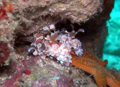 人気者のフリソデエビは順番待ちしないと写真に撮れないほど! 大好きなヒトデは放しませんっ! |