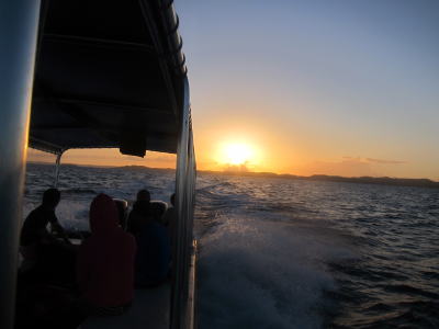 さて、翌朝は5時起きでカンムリブダイの産卵を狙いにいきました!! どんなに朝早くても 楽しいダイビングが待っているのでへっちゃらです(´∀`) 朝日を見ながらポイントへ〜♪ |