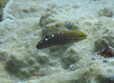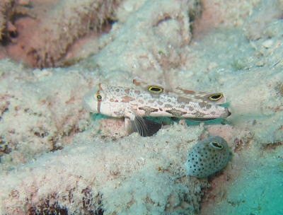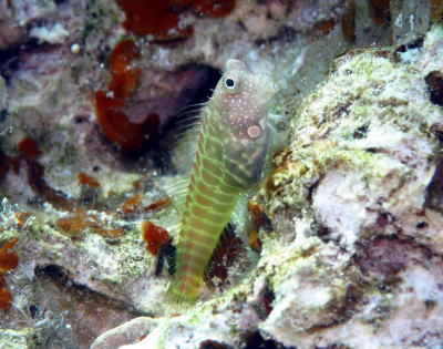 いつもは穴の中に入っているセグメンテッドブレニーさん どうやらこの体色は婚姻色らしく アピールで全身でてたのかもしれないですね(^○^) |