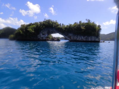 | 途中、ロックアイランドのプチ観光もしていただきました! こちらは自然の侵食で穴のあいた通称 メガネ橋! 他にも戦跡などをめぐり 戦後70年の慰霊もしてきました。 |