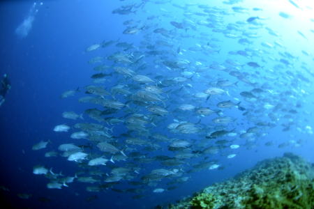 そして、言わずと知れた ギンガメアジの大群〜\(^O^)/ このあと、もの凄い流れにつかまって〜 |