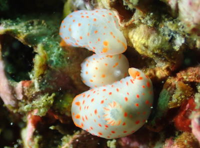 写真だけではちょっと判定しずらい感じですが・・・ 一応オオエラキヌハダウミウシってことにしました! 3匹で仲良く?!くっついていましたよ(^-^) |