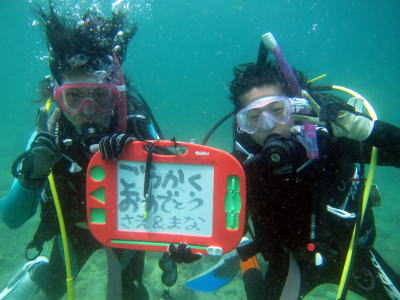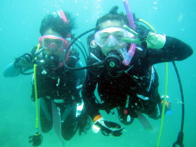 | 平日に夏休み真っ只中の中学生&小学生シスターズのOW講習へ行ってきました~! まずはプール講習からスタート! 水泳バリバリのお姉ちゃんとお姉ちゃんには負けないぞ!と意気込みの妹さん 時にはライバル、時には助け合いながら、スキルの練習を頑張ってやりました! プールでも、最後は一番深いところまで潜れましたね(*^_^*) あがってきたときに「楽しかったー♪」と言っていたお姉ちゃん、余裕でしたね! 午後からは初めての海での講習へ! プールで練習したことを海でも復習して、二人ともバッチリ上手にできました(^○^) 最初は重たい器材で泳ぐのも大変だったMちゃんも、だんだん上手にバランスとって泳げるように! 子供の吸収力、半端ないです(*^_^*) ![]() 水曜の夜はお泊りで、BBQを食べて21時には解散・おやすみなさーい! そして、翌朝も朝ごはんを食べて、海へGo!!! この日も穏やかな海でよかったね(^-^) ラスト2本頑張っていこう\(^O^)/ マスク脱着もドキドキだけど、上手にできましたね! ラストダイブは皆でファンダイブの練習~! 本当に最後は大人顔負けの上手な中性浮力で泳げるようになってきた二人! お姉ちゃんなんか、スイスイ先頭を泳いでいってましたね(´∀`) ![]() そして、二人とも無事に合格、ジュニアOWダイバーに認定です! おめでとうございます! これからもシスターズで仲良く楽しく遊びに来て下さいね~! ![]() |