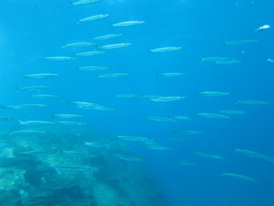 | 今回は毎ダイブと言っていいほど キビナゴ祭り&そこへ突っ込むカンパチの子供達の姿がっ! そして、写真をよーく見たら なんと1匹だけ中にツムブリさんも混じってました(^○^) |