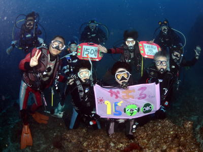| 水中は透明度も最高潮〜!!! もちろん記念撮影をして そして、水中胴上げに、 1500本を迎えられた記念のコメントもいただきました! |