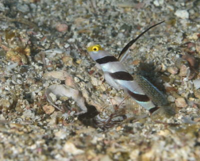 | 砂地ではヒレナガネジリンボウの姿も見られます! 一緒に住んでるエビさんは一生懸命お家を守っています(^-^) |