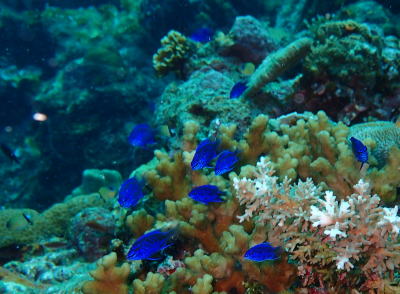 ハードコーラルやソフトコーラルが 入り乱れるように群生して スズメダイやハナダイの群れがいっぱいなんです(^-^) |