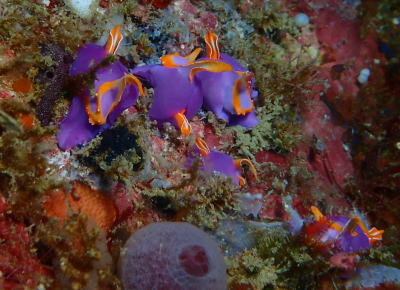 | おっと、ビックリのムラサキウミコチョウの大集団です! 皆で集会中だったでしょうか〜? 小さいウミウシですが、こんなに揃うと圧巻?! |