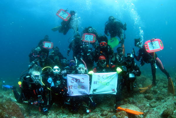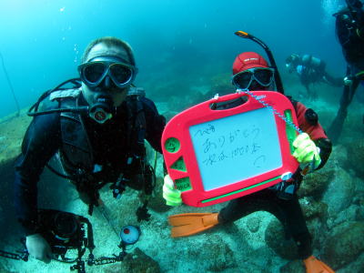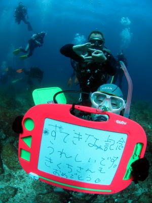 ![]() 水中では、参加者全員からのお祝いメッセージを渡しました! |