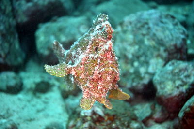 | さて、水中はどんな感じかといいますよ〜 カエルアンコウ祭りが開催中でした(*^_^*) こちらはめでたい紅白のクマドリカエルアンコウちゃん♪ ホヤに上手にかくれんぼしていました! |