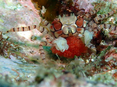 キンチャクガニさんはお腹にいっぱいの卵を抱えてました! 卵一粒一粒に黒い目玉が見えていましたよ〜(^-^) |