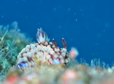 最後はウミウシシリーズ! なんともへんてこ?! 正面から見ると口ひげを生やした男爵風?! リュウキュウカスミミノウミウシ! |