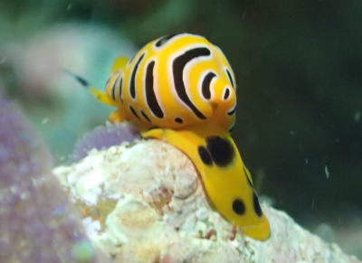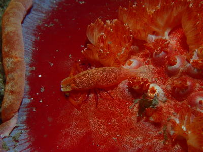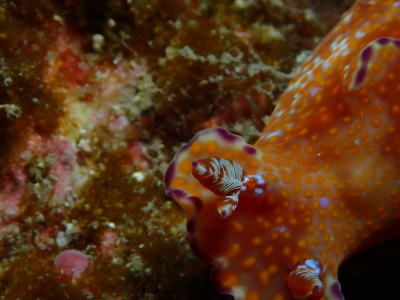 巨大ミカドウミウシにのっかっていたのは 巨大ウミウシカクレエビ〜(´∀`) 立派に丸々と太っておりますね! 美味しいものいっぱい食べたのかな〜? |