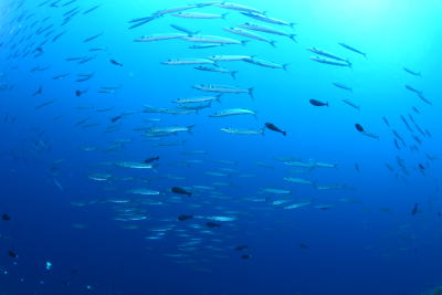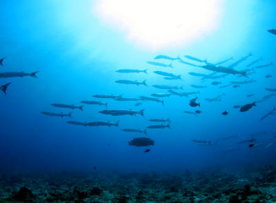 | なんとバラクーダの中にナポレオンちゃんが 混じっております(´∀`) しかもよーく見ると ナポちゃん大きく口をあんぐりのばしておりますよ♪ |