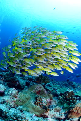 | 棚の上ではいつもヨスジフエダイや ノコギリダイが群れ群れ〜(^-^) いい感じでばっちり撮れていますね! |